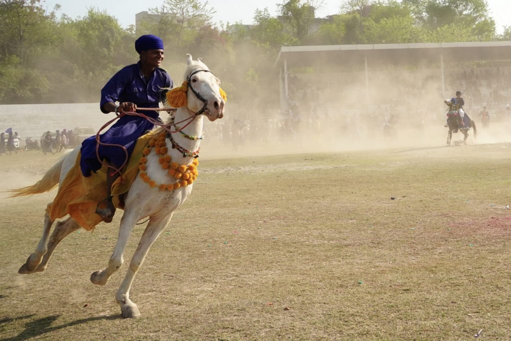Und die Pferde, diese berühmten filigranen edlen Wesen um die sich hier Vieles dreht, werden erst einmal im nahen Fluss gebadet. Der Umgang mit ihnen ist – vorsichtig gesprochen – im europäischen Sinne eher „robust“ bis brutal – man muss hier – leider – andere Maßstäbe ansetzen. Das steht in keinerlei Widerspruch zum Stolz der Sikhs auf ihre Tiere, fast jedes Einzelne bekommen wir vorgeführt, die Gewinnertiere werden zelebriert, hoch im Kurs stehen Albinos, die auch mal ohne Reiter ins Stadion geschickt werden, weil sie ja bereits von einem der Gurus gelenkt sind…