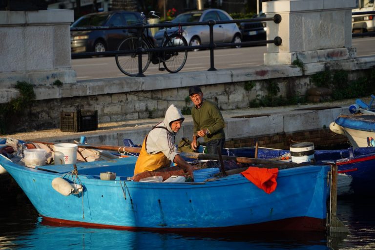 Leider gibt es auch Negativ-Seiten zu sehen und spüren: z. B. existiert der so viel in den Reiseführern angepriesene Fischmarkt am Lungomare praktisch nicht mehr (jedenfalls Wochentags), und zwar mangels – Fischen. Die paar Fische und Oktopusse, die die Fischer von ihren Booten geholt haben, würden kaum den Eigenbedarf decken, also woher kommt der ganze Fisch, der hier in den Restaurants serviert wird? – Nur mal so zum Nachdenken… Wir waren ein zweites Mal da, und ich habe mit meinen spärlichen Italienischkenntnissen verstanden, dass der Fisch nur noch sehr weit draußen zu finden ist – mit den kleinen Schollen, die sie im Hafen haben, kommen diese Fischer nicht weit…